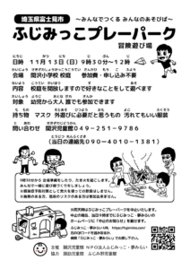 恵愛病院のびのびひろば「自然あそび」に協力のお知らせ 2023 11/12 ふじみっこからのお知らせ 2023.11.12 ふじみっこ・夢みらいは、恵愛っこ事業と題して、月に2回「1歳のお誕生会」と、月に1回「よちよちクラス」を開催しています。 そのご縁で11月18日に開催する、恵愛病院のびのびひろば「自然あそび」に協力しました。 自然を感じに来てください! ふじみっこからのお知らせ 令和5年「富士見市ふじみっこプレーパーク」開催のお知らせ 恵愛病院のびのびひろば「第2回 自然あそび」に協力のお知らせ 関連記事 ふじみっこプレーパークのお知らせ 2013.09.30 諏訪児童館かえっこバザール 2014.07.23 せきざわ子どもまつりに参加いたします 2010.02.23 平成23年度定期総会のお知らせ 2011.05.06 「富士見市ふじみっこプレーパーク」開催のお知らせ 2022.10.31 恵愛病院のびのびひろば「第2回 自然あそび」に協力のお知らせ 2024.10.16 ごあいさつ 2010.02.04 ラジオ出演 2013.05.13