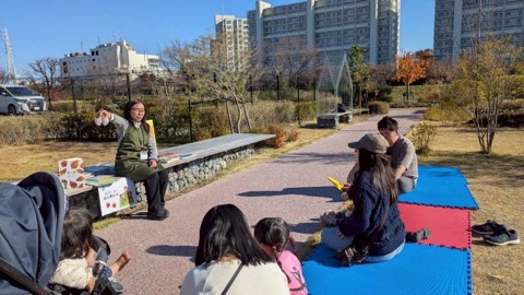 開催中、市立図書館鶴瀬西分館の大里館長による絵本の読み聞かせもあり、絵本を通して小さなお子さんやお父さんお母さん達もひろば内の自然を満喫していました。